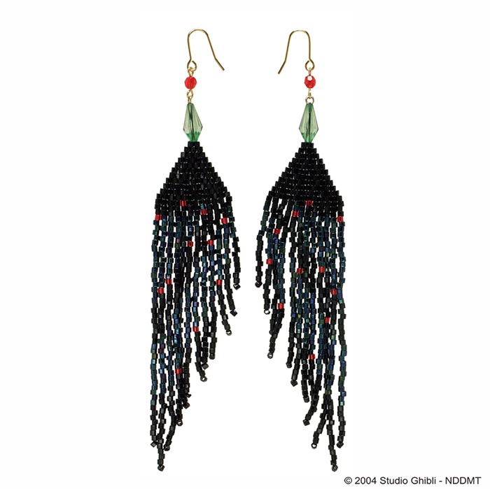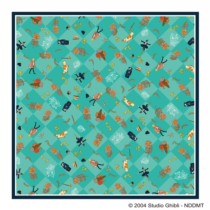 ハウルの動く城15周年を記念したテキスタイルのシリーズ。ハウルのベッドカバーに描かれているお花とハウルの服の模様をベースに、ハウルやヒン、荒地の魔女などが大集合している。