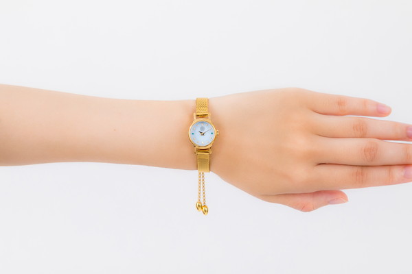ブレスレット感覚で楽しめる腕時計。文字盤は羽織りを連想させる淡いブルーのシェル素材が使用されており、見る角度によって表情が変わる。スカイブルーのストーンが上品な雰囲気に仕上げてくれる。