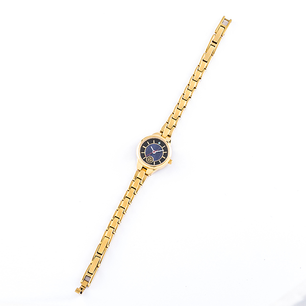 上品さと可愛らしさを兼ね備えた腕時計。12時のインデックスには瞳をイメージしたライトブルーのストーンがキラリと輝く。文字盤にはさり気なくストライプ柄もデザイン。