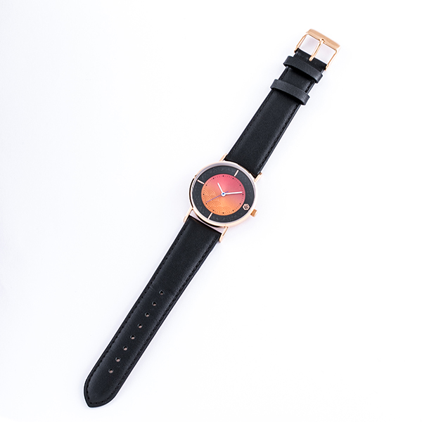 鮮やかなグラデーションの文字盤が目を引くデザイン。羽織りをモチーフにしたインデックスのフォルムや、縁にデザインされた模様がポイント。ブラックベースで幅広いカラーのコーデと合わせられるアイテムとなっている。