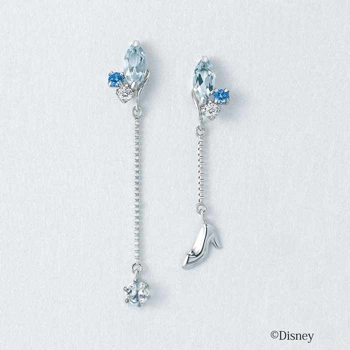 ガラスの靴をたよりに導かれる二人の運命をイメージしたピアス。トップには二人の惹かれあう心を表した美しいブルートパーズを、チェーンの先には魔法の煌きをイメージしたブルームーンストーン、そして物語のキーであるガラスの靴をあしらいました。アシンメトリーのデザインがファッショナブルで大人の女性にもお楽しみいただけます。