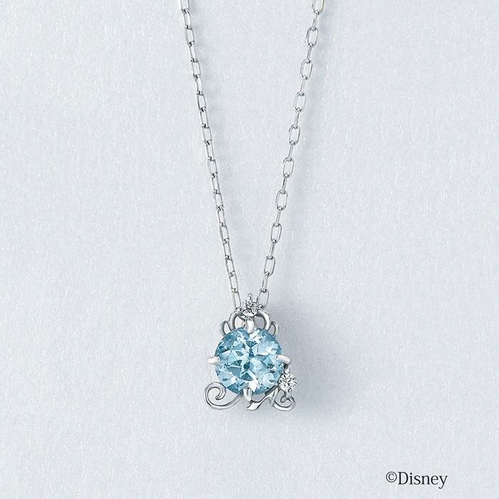 フェアリーゴットマザーが魔法をかけるシーンをイメージしたネックレス。メインモチーフはかぼちゃの馬車。トップにあしらったティアラと、馬車に添えたガラスの靴がさりげないポイントになっています。シンデレラの美しいブルーのドレスをあらわした大きなブルートパーズには繊細なカットを施し華やかな印象に仕上げました。