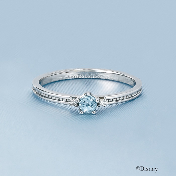 テイクアップのディズニーコレクションジュエリーから初のファッションリングが登場。魔法により美しく変身したシンデレラが期待を胸に舞踏会へ向かうシーンをイメージしています。メインのブルートパーズのとなりに輝くダイヤモンドとサイドのミル打ち風の装飾で上品な印象に。