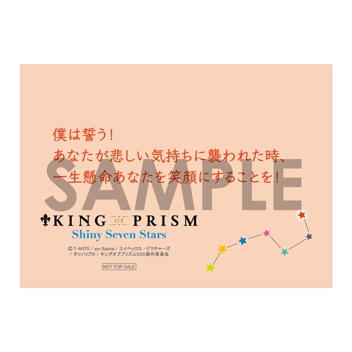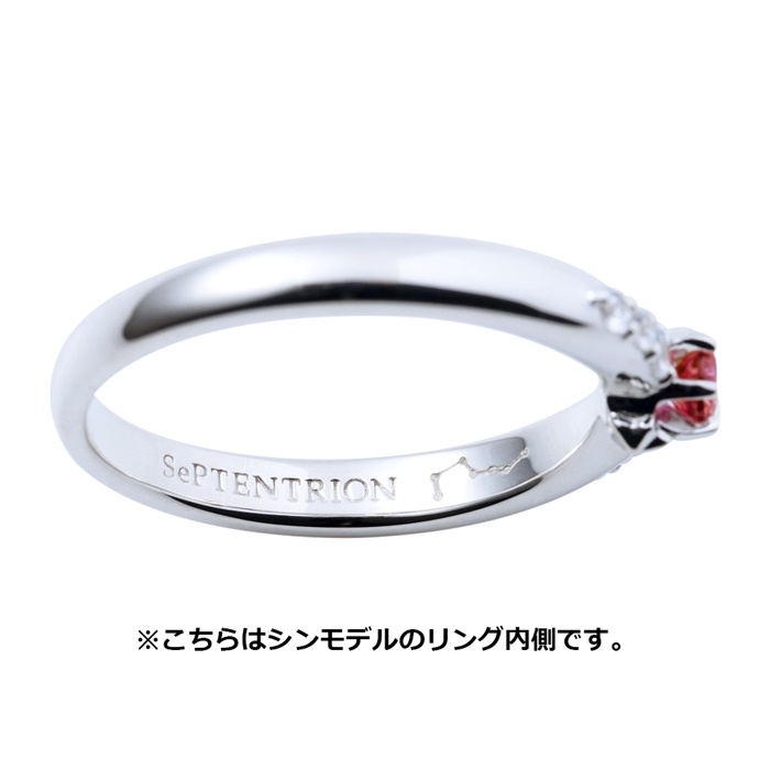 『KING OF PRISM-Shiny Seven Stars-』最終話のSePTENTRIONプリズムショーに登場する誓いのリングをイメージ。7つのストーンの中央には、煌めきを感じるキャラクターイメージカラーの大ぶりなストーンをセット。両サイドにある石座のさりげないスターモチーフがポイントだ。内側には“SePTENTRION”と北斗七星アイコンが刻印されている。