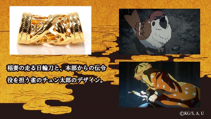 物語に登場する雀のチュン太郎と日輪刀のデザイン。日輪刀の刀身の稲妻の模様まで繊細に表現しました。