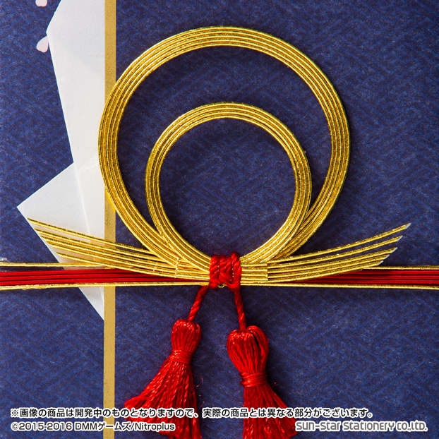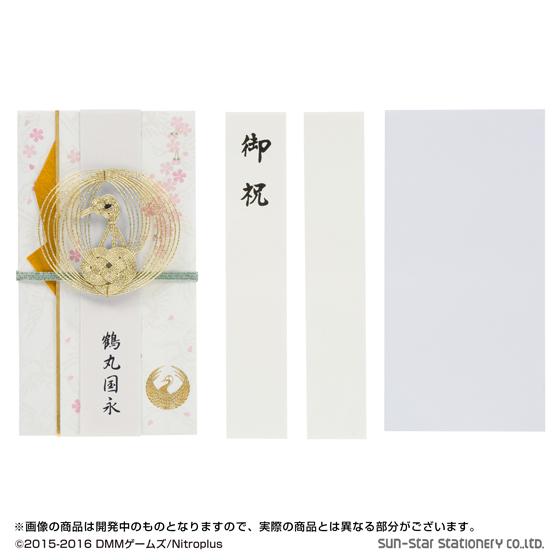 ご祝儀袋に用いられている水引飾りのデザインは、このご祝儀袋のためだけに日本の水引職人がデザインしたもので、刀剣男士それぞれの紋が一つ一つ手作りで豪華に再現されている。また、袋には金箔押しの紋も施されている。
