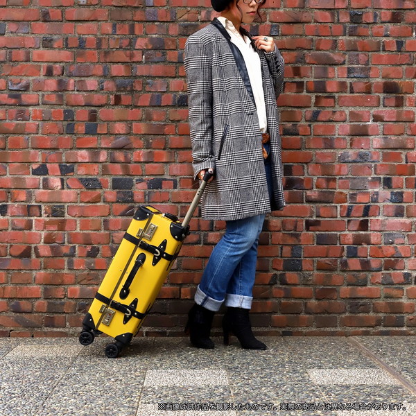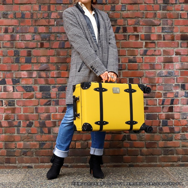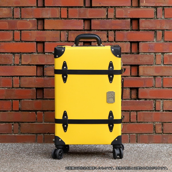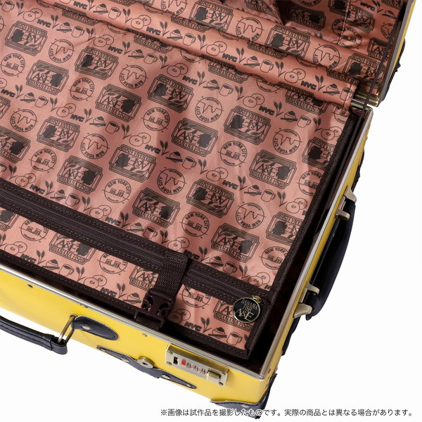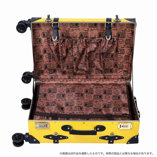 キャリーケースは、軽くて傷や汚れにも強い合皮素材。外面は、作品イメージカラーの黄色&黒が映えるクラシカルなデザインとなっている。アンティ ークゴールドの金具に彩られたベルトを外せば、アッシュ&英二をイメージした山猫&鳥モチーフや二人のイニシャル、 さまざまな思い出が詰まったデザインが広がる。ワンタッチ開閉可能なマグネットベルト、360度自由に回転する4輪キャスター、横置きにも安心な底鋲付きだ。内面は、ゴムタイプで出し入れしやすい収納ポケット、ファスナーポケット付き間仕切り、荷崩れ、荷物飛び出し防止ベルト付 き収納スペース等、収納面も機能性抜群。
