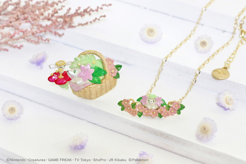 シェイミとお花畑ネックレス 4,000円+税/シェイミとフラべべブローチ 4,600円+税