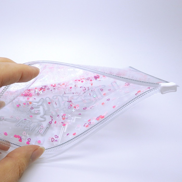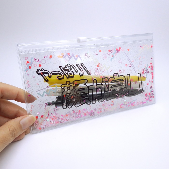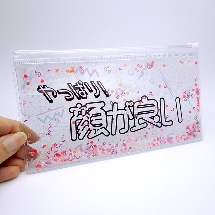 「やっぱり顔が良いなぁ」と言う気持ちを噛みしめる為、いつも持ち歩けるようフラット型のスライダーポーチにロゴをプリント。ポーチを振ると、中のグリッターがシャカシャカと鳴ってより一層「やっぱり顔が良い」と言う気分を盛り上げてくれる。