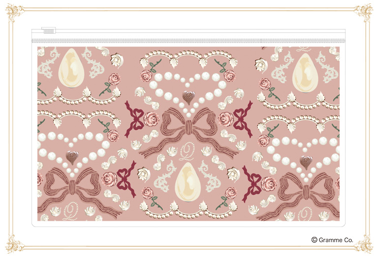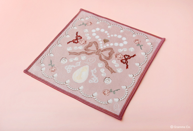 アンティーク感漂うパール、リボン、ローズ・・・。くすみ感のあるスモーキーピンクがマリーアントワネットの世界へ誘ってくれそうな上品なデザインと肌触りが魅力のミニタオル。