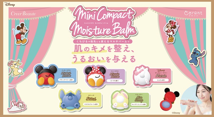 バンダイが運営する化粧品ブランド『CreerBeaute(クレアボーテ)』より、コスメポーチに入れてコロンといつでも持ち運べるコスメシリーズ『Coront(コロント)』からディズニー“ミニコンパクトモイスチャーバーム”(1,078円/税込)が2020年1月下旬より順次全国のドラッグストア・量販店・バラエティショップ等で販売開始。(発売元:株式会社バンダイ クレアボーテ)