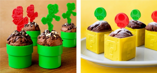 オーブンで手軽に焼き菓子が作れる耐熱性のマフィンカップとキャラクターピックのセット。マリオが土管から飛び出すシーンやハテナブロックからキノコが現れるシーンを再現できる。