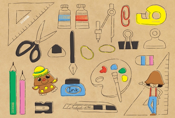 身近なものを駆使して作品を披露するノッポさん(高見のっぽ)と相棒のゴン太くん、そして工作するときに使う道具をデザイン。