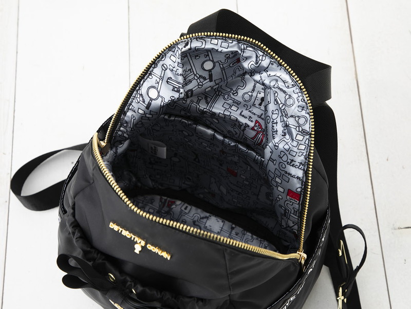 黒を基調とした卵型のシンプルなボディに、“DETECTIVE CONAN”と鍵穴マークの金ロゴが映える『名探偵コナン』をイメージしたリュック。内側生地には、トムス・エンタテインメントの“『名探偵コナン』バッグシリーズ”でおなじみのモチーフ柄がプリントされている。