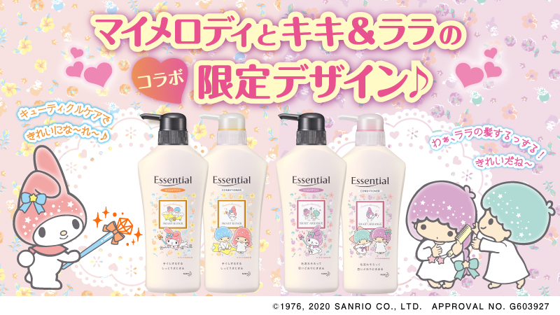2020年2月15日(土)より、ヘアケアシリーズ『エッセンシャル』から“マイメロディ”と“リトルツインスターズ”(キキ&ララ)がコラボレーションしたスペシャルデザインボトルを数量限定で発売。