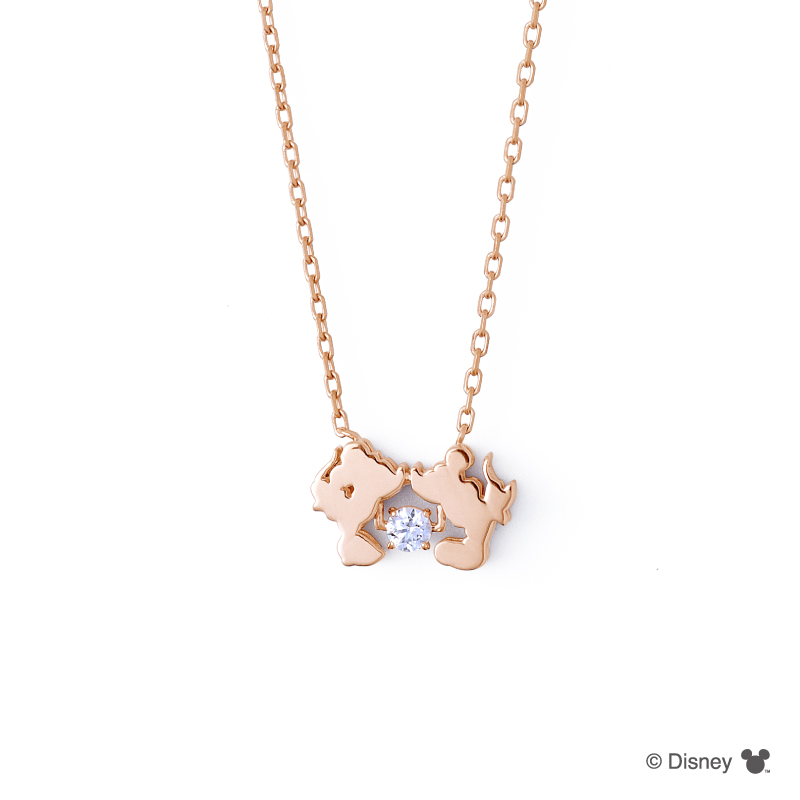 ミッキーとミニーがキスをしているシルエットがキュートなネックレス。 厚みのあるトップは、 細部まで表現したデザインがポイント。ふたりの間には、幸せいっぱいの輝く瞬間を表すかのように、特殊なセッティングによりキラキラと揺れるストーンが美しくきらめく。