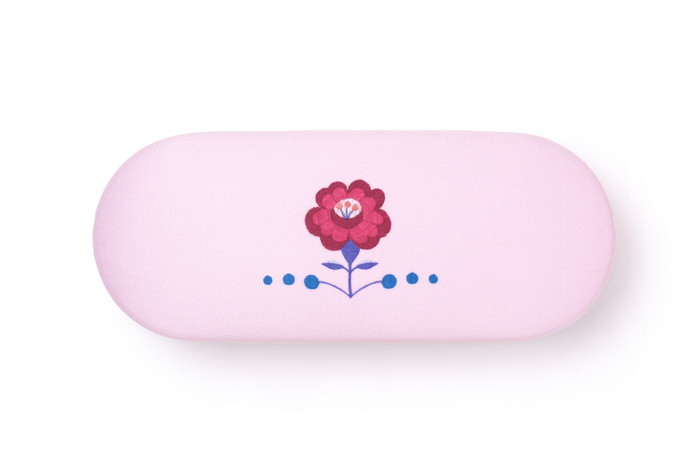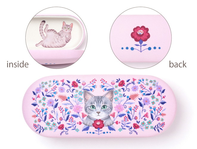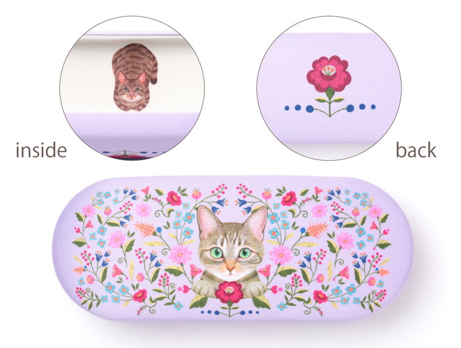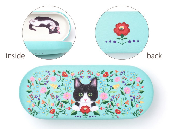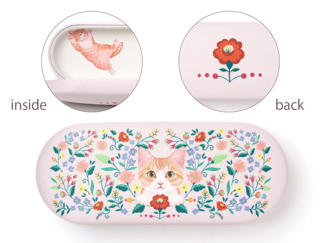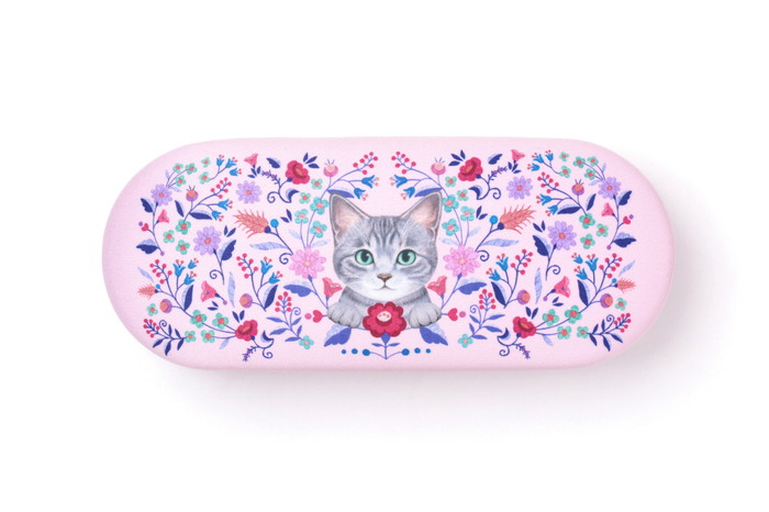 刺繍風の花に囲まれた猫がひょっこり顔を覗かせているかわいいメガネケース。