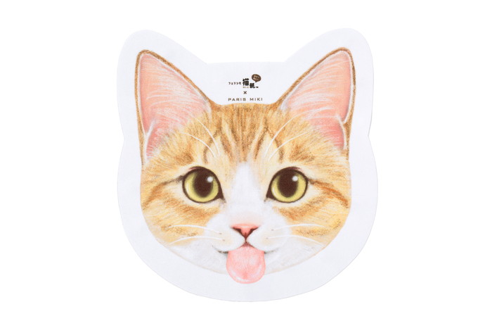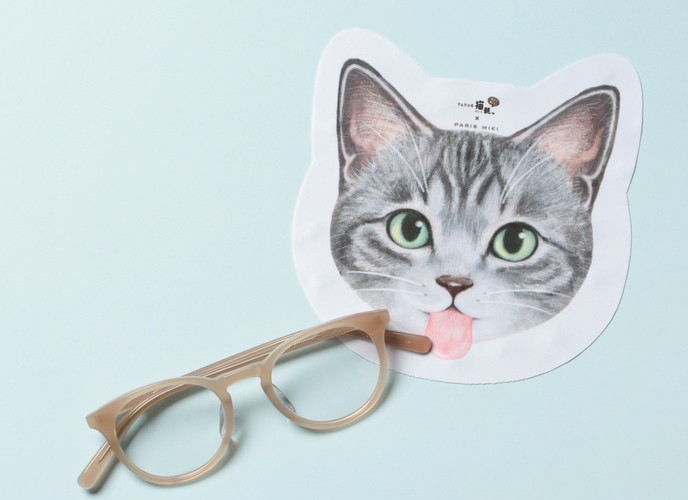 等身大に近いサイズの猫が舌を出しているキュートなメガネ拭き。猫が一生懸命ぺろぺろなめて、メガネをピカピカにしてくれるイメージが表現されている。