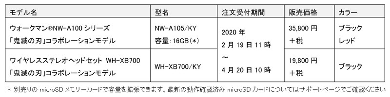 また、本モデルは、ANIPLEX+でも販売。ソニーストアとANIPLEX+では購入特典が異なる。ソニーストアで販売されるモデルは、ウォークマン(R)、ヘッドホン共通特典として『鬼滅の刃』A4クリアファイル(1種)を同梱。ANIPLEX+で販売されるモデルは、ウォークマン(R)購入特典として『鬼滅の刃』木製コースター(2枚セット)、ヘッドホン購入特典として『鬼滅の刃』オリジナル巾着が同梱予定。