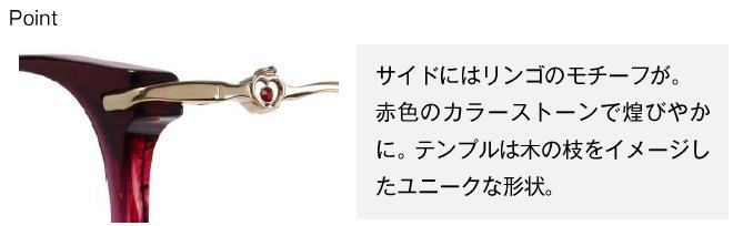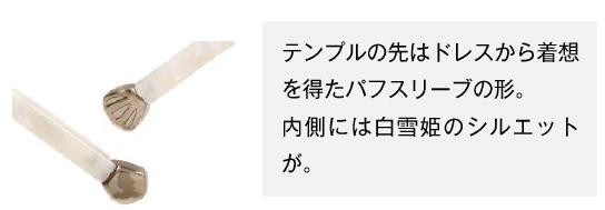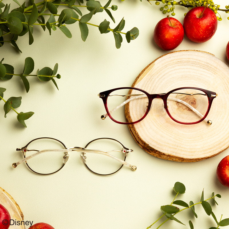 “思いやりがあって前向きなプリンセス”白雪姫をイメージしたシリーズは、物語の鍵となるリンゴをあしらったサイドがポイント。テンプル(つる)の先端には白雪姫のドレスのパフスリーブを再現したメタルパーツ付き。