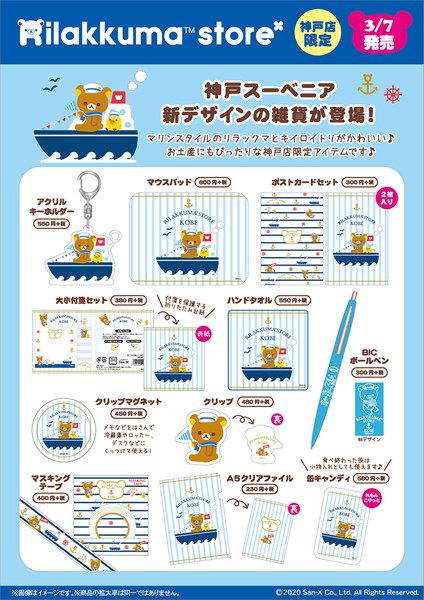リラックマストア神戸店限定商品は、港町の神戸にちなんで、マリンルックのぬいぐるみ。セーラー服を着たリラックマのほか、船になりきった(?)キイロイトリがラインナップされた。そのほか、お土産にも普段使いにもぴったりな神戸スーベニア新デザインの雑貨も登場した。