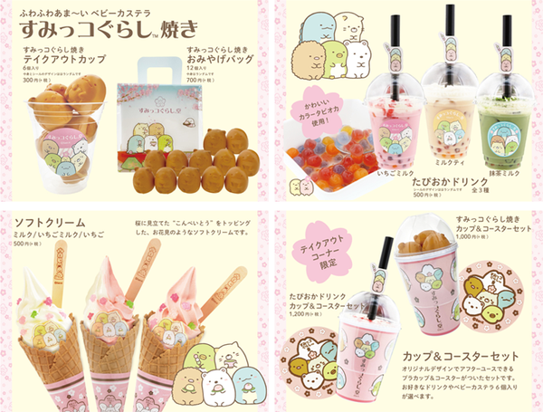 また、テイクアウトフードにも、可愛くておいしいスイーツが続々。すみっコぐらしのキャラクターの形をしたふわふわ甘いベビーカステラ「すみっコぐらし焼き」や、カラフルなタピオカが入ったオリジナルドリンク、桜に見立てた”こんぺいとう”が可愛いソフトクリームなど、SNS映え間違いなしの商品がズラリ。持ち帰りできるカップ&コースターもぜひ一緒にチェックしていただきたい。
