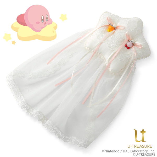 また、ワープスターにリングをのせて星空へ飛んでいく様子をイメージしたリングピローは、リングを支えるように持つカービィとワドルディをイメージした特別なリング留めに。 繊細なレースやリボンで上品にカービィの世界観が表現されている。