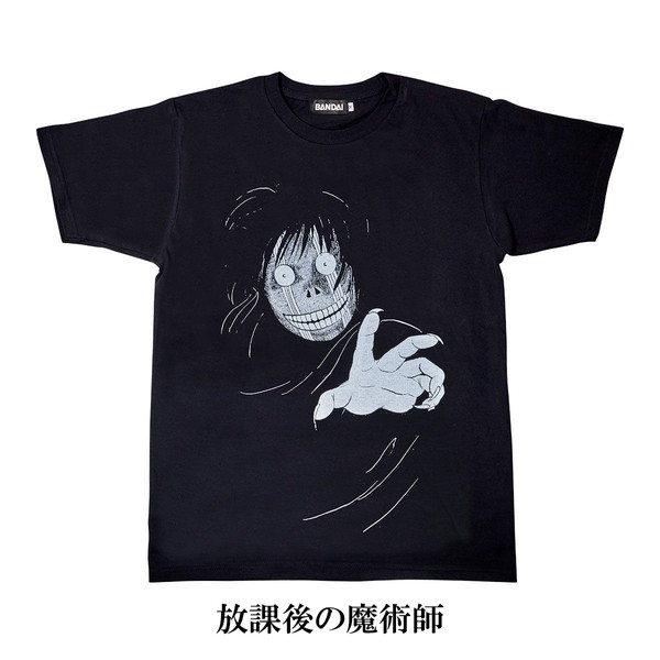本商品は、ミステリー漫画の金字塔『金田一少年の事件簿』に登場する怪人たちのみをフィーチャーしたTシャツ。「オペラ座館殺人事件」より、窓から美雪を覗く“怪人ファントム”。「学園七不思議殺人事件」より、多くの人のトラウマであろう“放課後の魔術師”。「魔術列車殺人事件」より、金田一最大の宿敵である“地獄の傀儡師”。「魔神遺跡殺人事件」より、忘れがたい風貌の“凶鳥の命”の全4種類がラインナップされた。