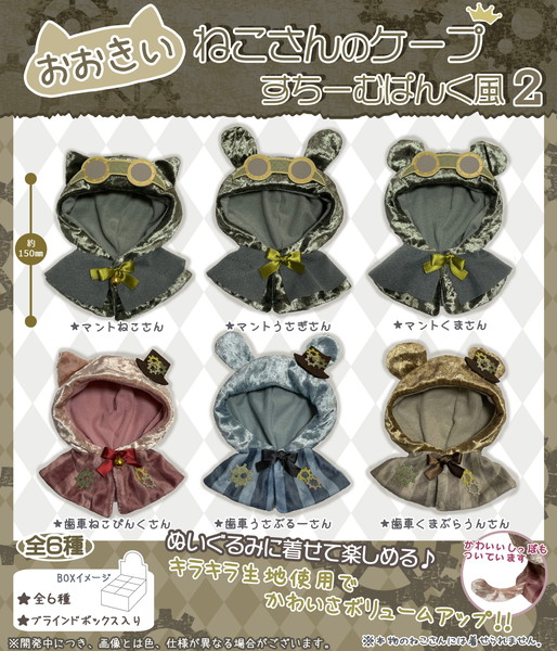 ぬいぐるみに着せて遊べる「おおきいケープシリーズ」に新商品「すちーむぱんく風ケープ」の第2弾が登場した。お手持ちのぬいぐるみをノスタルジックにかわいくお着替えさせられます。