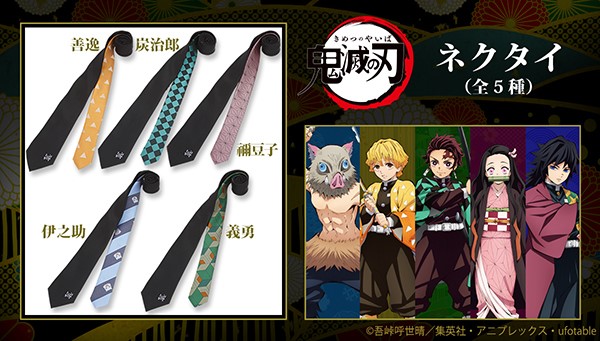 また同時に、炭治郎、禰豆子、善逸、伊之助、義勇にフィーチャーしたネクタイが初登場。それぞれの着物や被り物をオリジナルでデザインしており、いずれも“滅”の字がワンポイントで入っている。