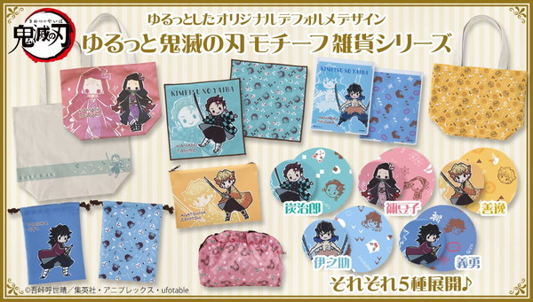 TVアニメに登場する、炭治郎、禰豆子、善逸、伊之助、義勇の5人をゆるっとしたデフォルメデザインにアレンジした「ゆるっと鬼滅の刃 モチーフ柄ランチトート」「ゆるっと鬼滅の刃 モチーフ柄ミニタオルセット」ほか計10アイテムの予約が受付中だ。