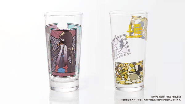『Fate/Grand Order』のサーヴァントが描かれたタンブラーグラス。ステンドグラス風のデザインにより、それぞれアスクレピオスは霊基再臨第1段階から第3段階のバトルキャライラストと、イアソンは宝具演出をイメージしたイラストが描かれている。