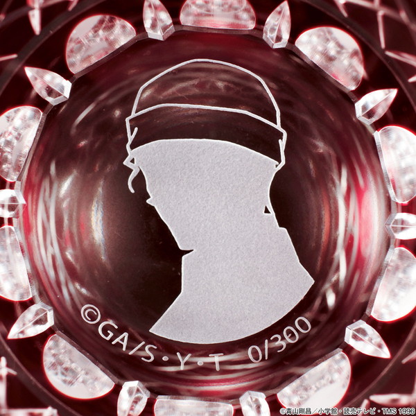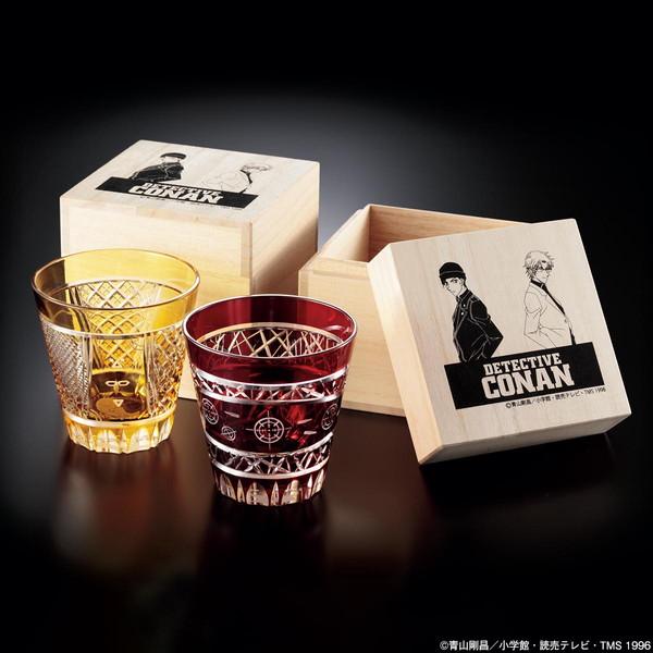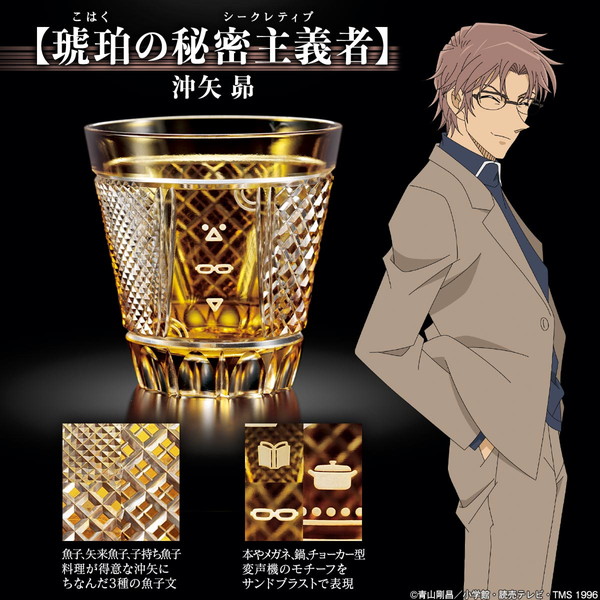 本商品では、赤井と沖矢、交差するふたつの顔を、伝統の和柄がアレンジされた粋な文様でガラスに表現。赤井秀一をイメージした【緋色の狙撃手(スナイパー)】と、沖矢昴をイメージした【琥珀の秘密主義者(シークレティブ)】という、匠の技から生み出された美しいカットが煌めく2種類がラインナップされた。