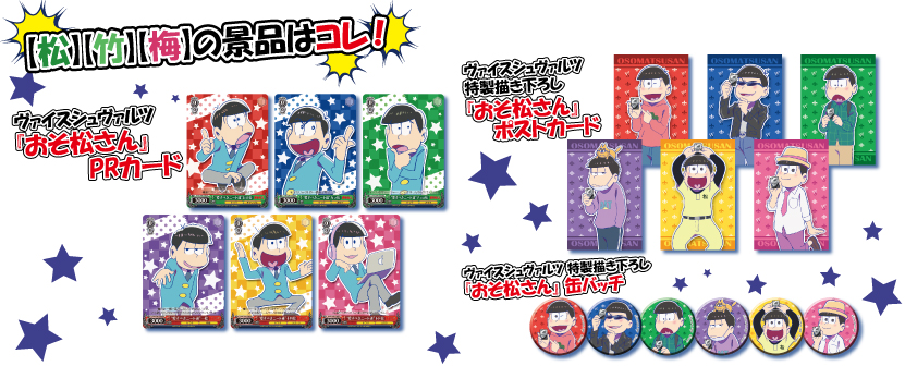また今回の発売を記念して、アニメイトとヴァイスシュヴァルツではキャンペーンが開催される! 「ヴァイスシュヴァルツはじめ松セット『おそ松さん』」もしくは「ブースターパック『おそ松さん』」を2,000円以上購入ごとに、ヴァイスシュヴァルツ特製『おそ松さん』グッズが必ずもらえる「おそ松さんWSくじ」に1回チャレンジすることができる。景品は「松」「竹」「梅」と分かれているので、要チェック!