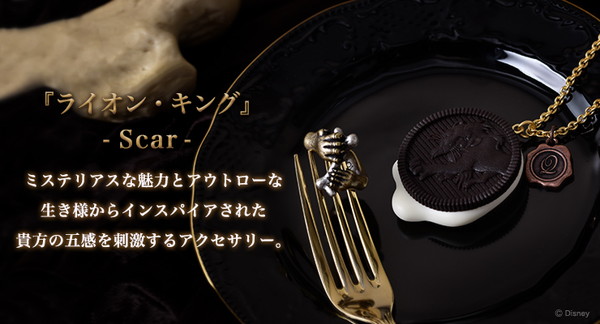 ザクザクした食感とビターな味わいが“スカー”の雰囲気と見事に融合した甘さ控えめのクッキーサンド。バニラクリームとの絶妙なハーモニーが容易に想像できるほどリアルな質感が特徴。五感を刺激するアクセサリー。