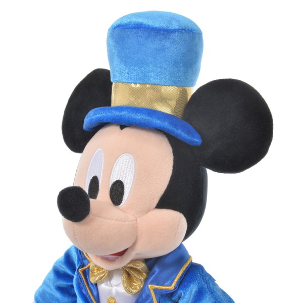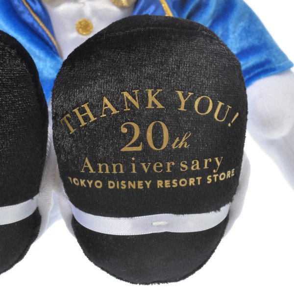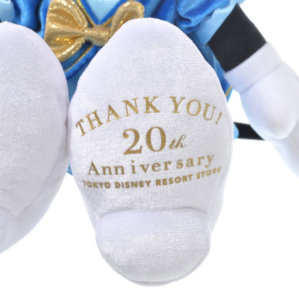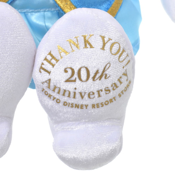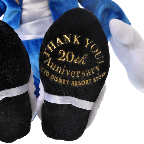 燕尾服にシルクハットでかっこよく正装したミッキー。足裏には「THANK YOU! 20th Anniversary」のメッセージロゴ入りで、座ったポーズで可愛く飾ることができる。
