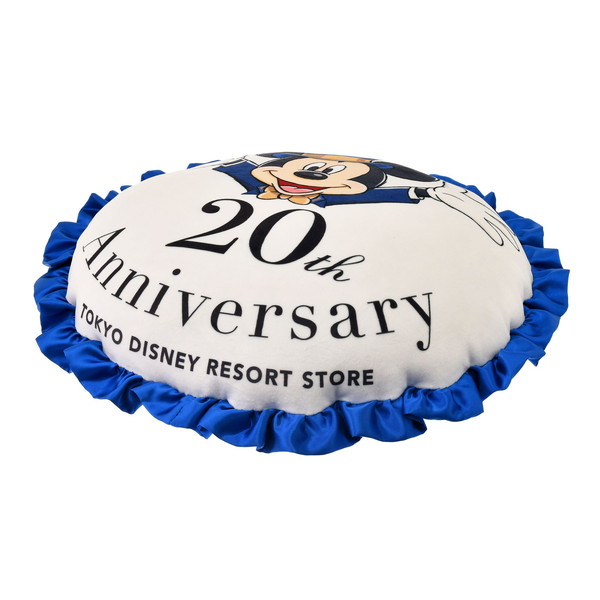 ミッキー&フレンズデザインのもっちりクッション。正装したミッキー、ミニー、ドナルドたちが手をつないでいるオリジナルアートをデザイン。笑顔のキャラクターたちが描かれ、お祝いムード満点! 反面には「20th Anniversary」のアニバーサリーロゴとミッキーを大きくプリント。鮮やかな青色のサテンフリルが特別感を盛り上げる。