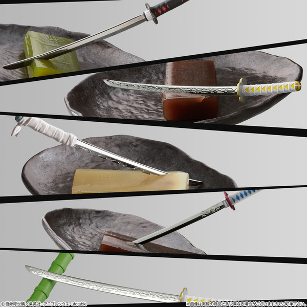 菓子切の刀身は、実際に羊羹を“斬る”ことができる全長約140mmの金属製仕様で、金属食器で名高い新潟県燕市で製造されたもの。炭治郎・善逸・伊之助・義勇の4種類の日輪刀を、刀身だけでなく鍔・柄においても忠実に再現している。ラインナップ中の一刀、炭治郎の黒刀は、刀身を成型した後に“黒酸化発色”というステンレスを加工する工程を施し、黒光りが映える色合いに。