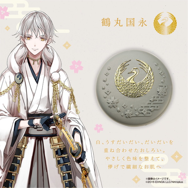 鶴丸国永は、白・うすだいだい・だいだいの3色のパウダーで、混ぜ合わせて使用すれば、肌の色味を整えて、繊細で儚げな印象に仕上げる。山姥切長義は、淡黄・うす水色・うす桃色の3色のパウダーで、ヴェールを纏ったような涼しげで透明感のある肌に仕上げるという。