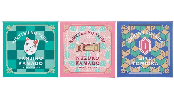 炭治郎、禰豆子、義勇の全3種のチークカラー。コンパクトなので持ち運びにもとても便利。炭治郎は額の傷痕の色からオマージュを受けたテラコッタ色、禰豆子は着物のカラーイメージのキュートなピンク、義勇は羽織の色をアレンジしたオレンジカラーのチーク。