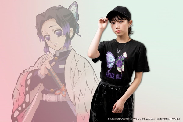 今回、メインヒロインである竈門禰豆子と胡蝶しのぶ・胡蝶カナエ・栗花落カナヲの胡蝶姉妹にフィーチャーし、ANNA SUIのブランドモチーフである蝶や薔薇とコラボレーションしたオリジナルデザインを制作。禰豆子の着物の柄と薔薇を組み合わせたデザインや、胡蝶姉妹の蝶の髪飾りをANNA SUIらしい手法で描いたデザインなど、『鬼滅の刃』の世界観と「ANNA SUI」の世界観を融合させた、特別なデザインのコレクションとなっている。