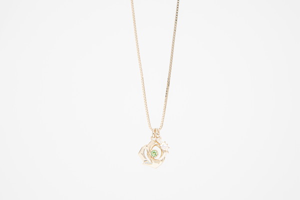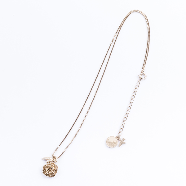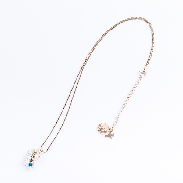 イギリスをモチーフにしたネックレスのトップには美しく咲いたバラの花や、魔法を連想させるキラキラしたチャームがあしらわれた。エンドパーツには地球や⾶⾏機といった「ヘタリア」ならではのモチーフが︕ 主張しすぎないサイズ感なので、お⼿持ちのネックレスとの重ね付けで無限⼤の楽しみ⽅が出来るのも◎
