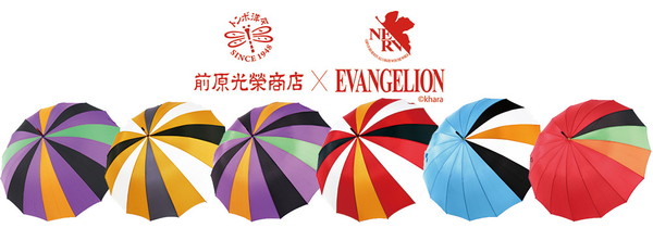 老舗洋傘メーカー「前原光榮商店」の70周年を記念して制作された「エヴァンゲリオンコラボレーション洋傘」シリーズ「サードインパクトバージョン」「エヴァンゲリオン零号機モデル/初号機モデル/2号機モデル」「綾波レイモデル/式波・アスカ・ラングレーモデル」の全6種類。