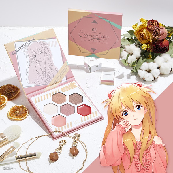 メイクパレットは、式波・アスカ・ラングレー、綾波レイ、真希波・マリ・イラストリアスの描きおろしイラストをデザインし、それぞれのキャラクターをイメージしたカラーをセット。ルースパウダーは「A.T.フィールド」をモチーフにしたデザイン。リップグロスはエヴァンゲリオンのパイロットをイメージし、2色のカラーが楽しめるフェイスカラーは「ゆるしと」がデザインされており、どれも一番コフレならではの特別なデザインコスメとなっている。
