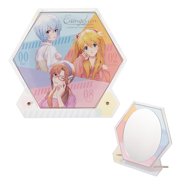 アスカ、レイ、マリの描きおろしイラストを使用したスタンドミラー。私服styleのキュートな3人となら毎日のメイクも楽しくなれそう。