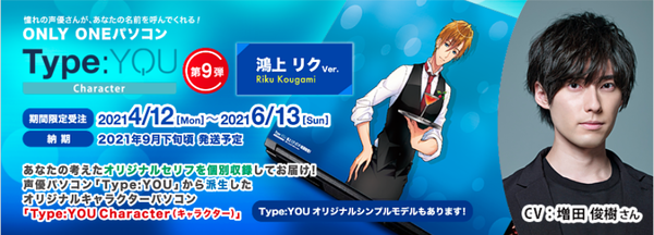 声優オリジナルパソコンのキャラクターシリーズ【Type:YOU Character(読み:タイプ ユー・キャラクター)】第9弾が発売決定。キャラクターボイスに増田俊樹を迎え、「鴻上 リク(こうがみ りく)」モデルが期間限定受注となる。