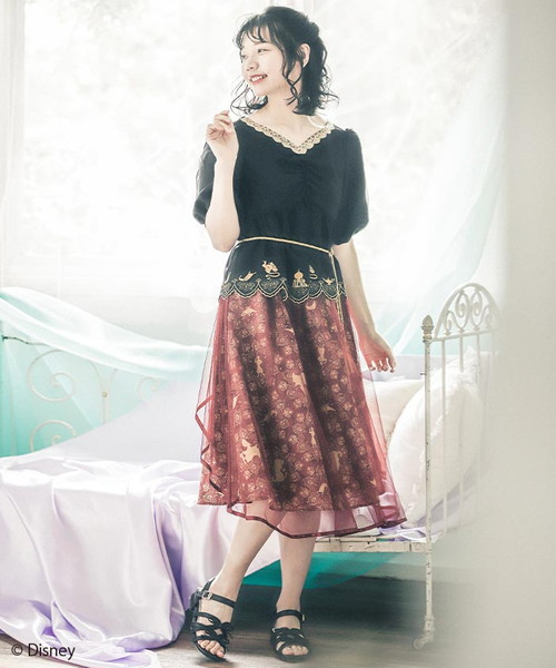 「ジャスミン」「ラジャー」「ジーニー」「魔法のランプ」「アブー」「魔法の絨毯」のシルエットが裾にあしらわれた華やかなワンピース。孔雀の羽が「ジャスミン」の華やかさと可憐さをイメージさせるアイテム。肩開きのデザインやふわっとした袖、 デコルテの繊細なレース使いがまるでプリンセスのような1枚に。