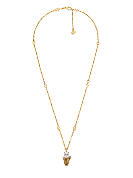 ゴールド仕上げのメタルネックレスに「ばなにゃ」のペンダントトップ(クリスタルとエナメル)をあしらったもの1点