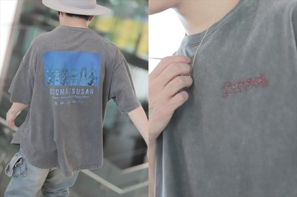 Tシャツは、バックプリントに第3期オープニングの「6つ子のかぶりもの」カットを使用、古着感を演出するためのウォッシュ加工がほどこされたブラックボディを含む2色展開。また、スカジャンは、デザイナー・岡田考功氏を招き制作され、生地・リブ・色使いから、龍と6つ子のイラストを併せた背面デザイン、前面デザイン、さらにタグのデザインまで、全てに入野自由のこだわりが詰まっている。