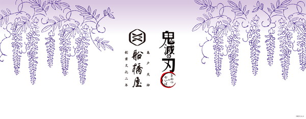 亀戸天神は江戸から人々に愛されている、 東京一の藤の名所といわれています。 船橋屋は初代が亀戸天神の境内でくず餅を出したことから始まり、 明治の初期には隣へお店を構えました。 店頭の藤棚は、 時期になると見事に咲き乱れます。創業当時から密接な関係にある亀戸天神と船橋屋。 それを繋いでいる藤の花。TVアニメ「鬼滅の刃」においても藤は特別な花。藤の花に親和性があるという共通点から、 今回の商品化に至った。
